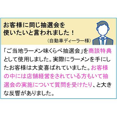 | 賞味期限 | 180日(残日数90日以上) 【特賞】ご当地ラーメン 味めぐり7食・・・180日(常温) 【1等】ご当地ラーメン 味めぐり5食・・・180日(常温) 【2等】ご当地ラーメン 味めぐり3食・・・180日(常温) 【3等】ご当地ラーメン 味めぐり2食・・・180日(常温) 【4等】比内地鶏らーめん1食・・・180日(常温) |